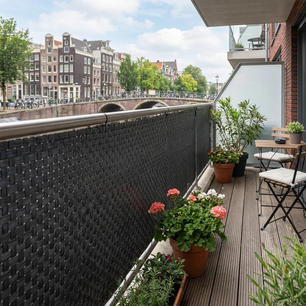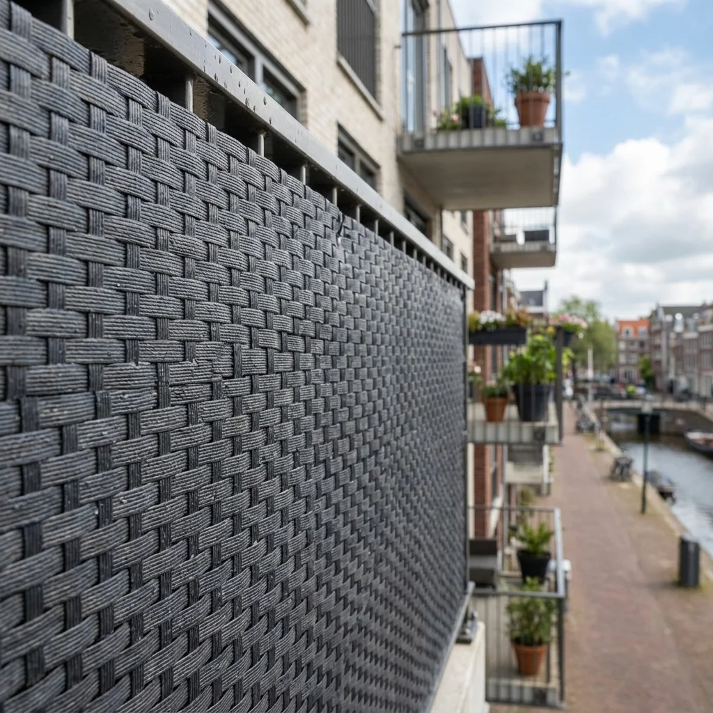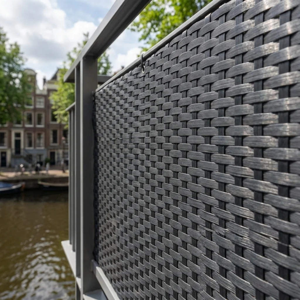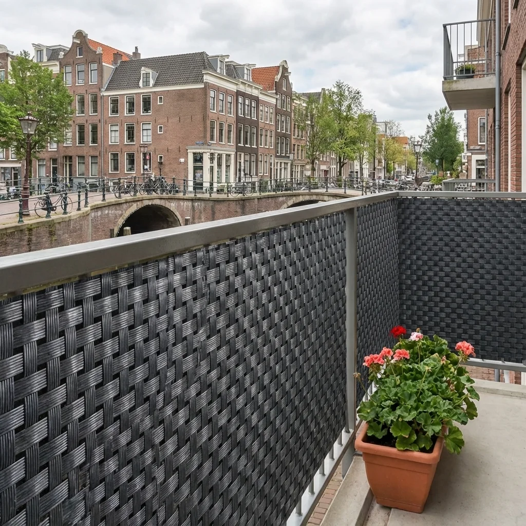 Dit balkonscherm is geweven uit polyrattan strepen. Deze innovatieve manier van weven zorgt er voor dat de strepen juist met elkaar worden verbonden. Zo zorgt het er ook voor dat u dit balkonscherm kan knippen op elk punt, zonder de kwaliteit van het scherm te verliezen. Het balkonscherm antraciet heeft geen onderhoud nodig en het is eenvoudig schoon te maken met standaard schoonmaakmiddelen. Gebruik geen bleek om het doek schoon te maken.