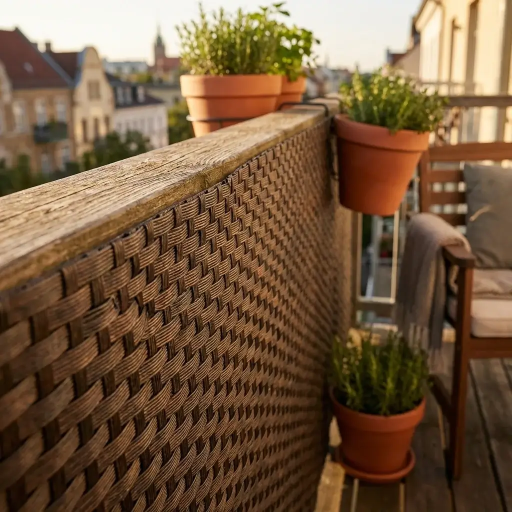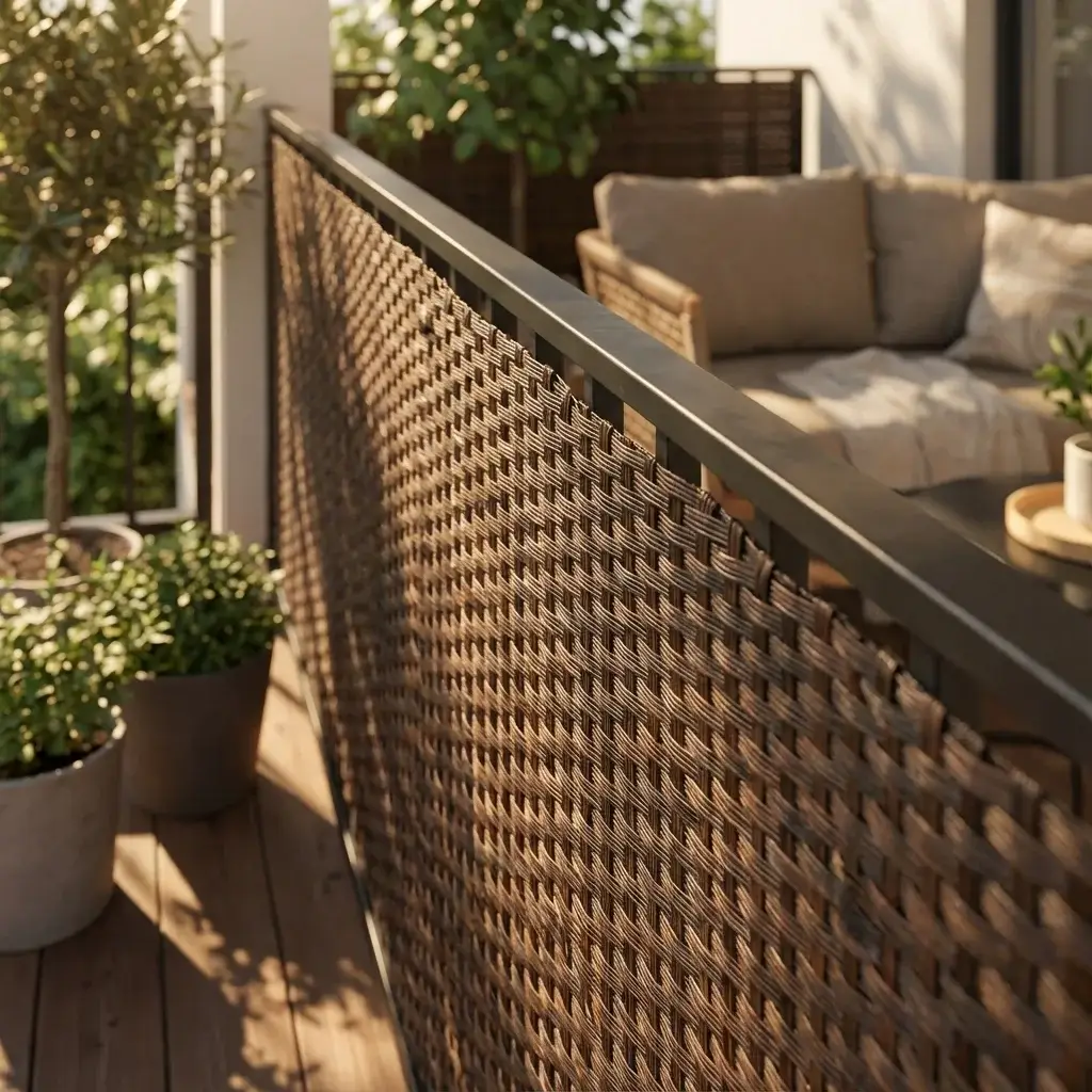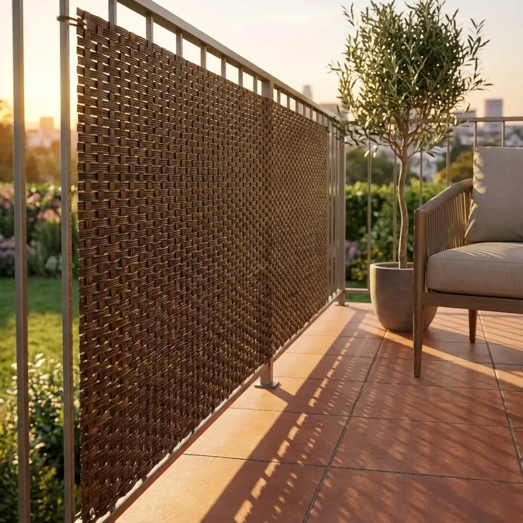 Dit balkonscherm is geweven uit polyrotan strepen. Deze innovatieve manier van weven zorgt er voor dat de strepen juist met elkaar worden verbonden. Zo zorgt het er ook voor dat u dit balkonscherm kan knippen op elk punt, zonder de kwaliteit van het scherm te verliezen. Het balkonscherm donkerbruin heeft geen onderhoud nodig en het is eenvoudig schoon te maken met standaard schoonmaakmiddelen. Gebruik geen bleek om het doek schoon te maken.