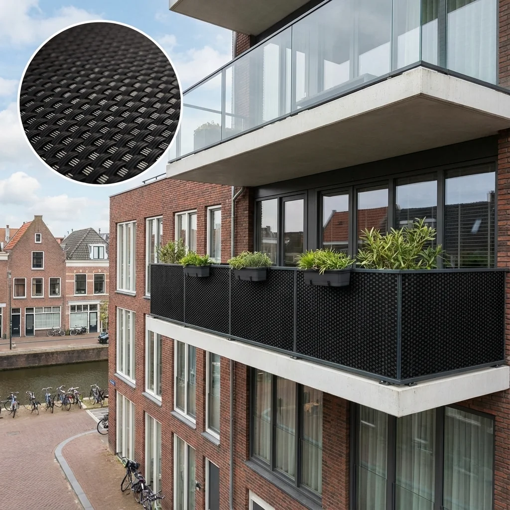 - Kabelbinders: Zorg er voor dat er tussen de 10 à 15 cm een kabelbinder zit voor het beste resultaat. U kunt de kabelbinders eenvoudig door het balkonscherm halen en zo vastmaken aan uw balkonrailing.