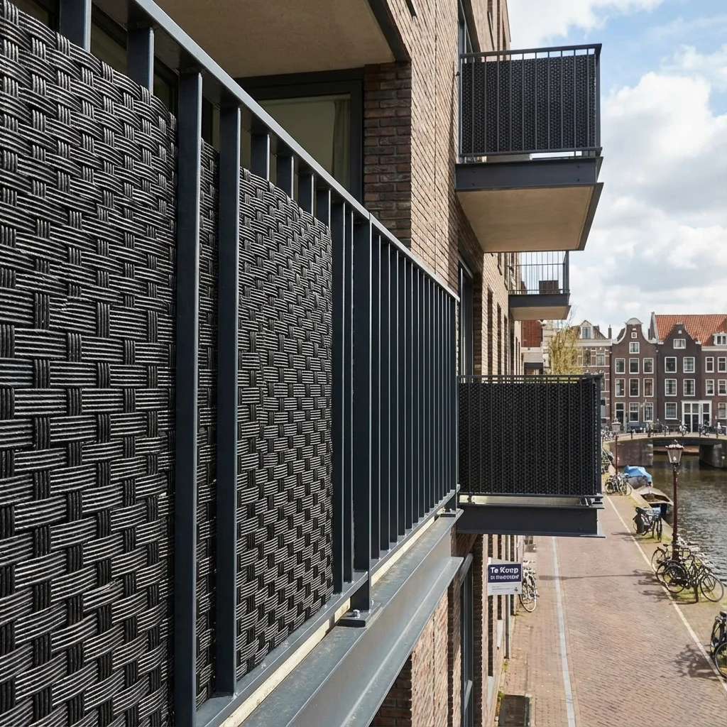 Het balkonscherm is eigenlijk onverwoestbaar. De weersomstandigheden hebben geen effect op het scherm zelf en het scherm is zeer flexibel. Zo kunt u het om balkon palen weven, maar ook door de spijlen heen halen. Er worden standaard t-wraps geleverd in de kleur van het scherm.