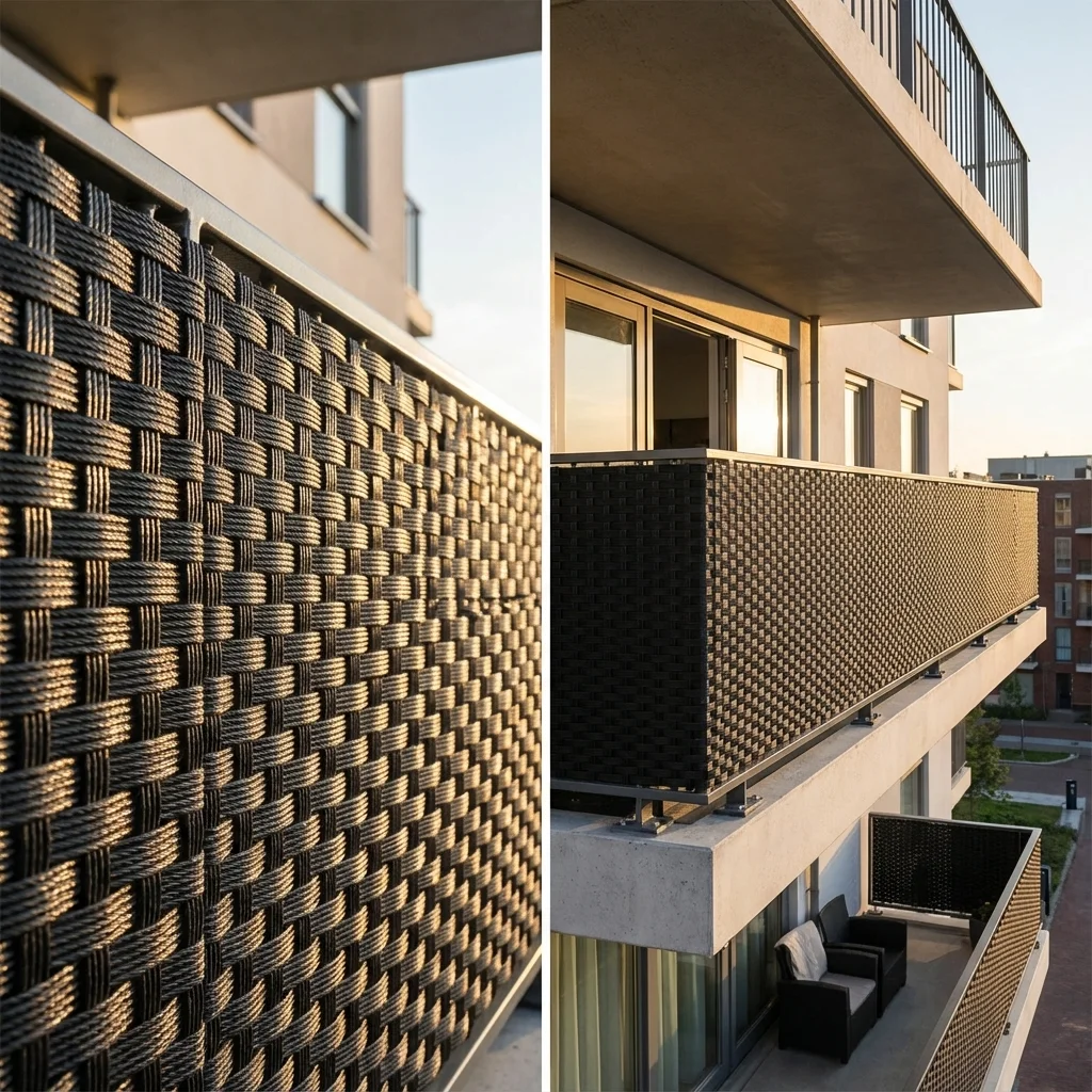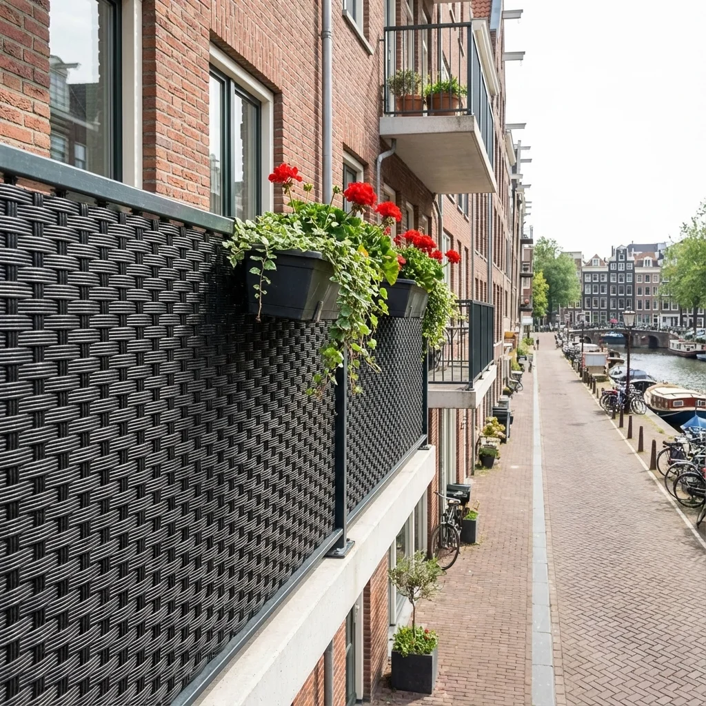 Dit balkonscherm is geweven uit polyrattan strepen. Deze innovatieve manier van weven zorgt er voor dat de strepen juist met elkaar worden verbonden. Zo zorgt het er ook voor dat u dit balkonscherm kan knippen op elk punt, zonder de kwaliteit van het scherm te verliezen. Het balkonscherm bruin & zwart heeft geen onderhoud nodig en het is eenvoudig schoon te maken met standaard schoonmaakmiddelen. Gebruik geen bleek om het doek schoon te maken.