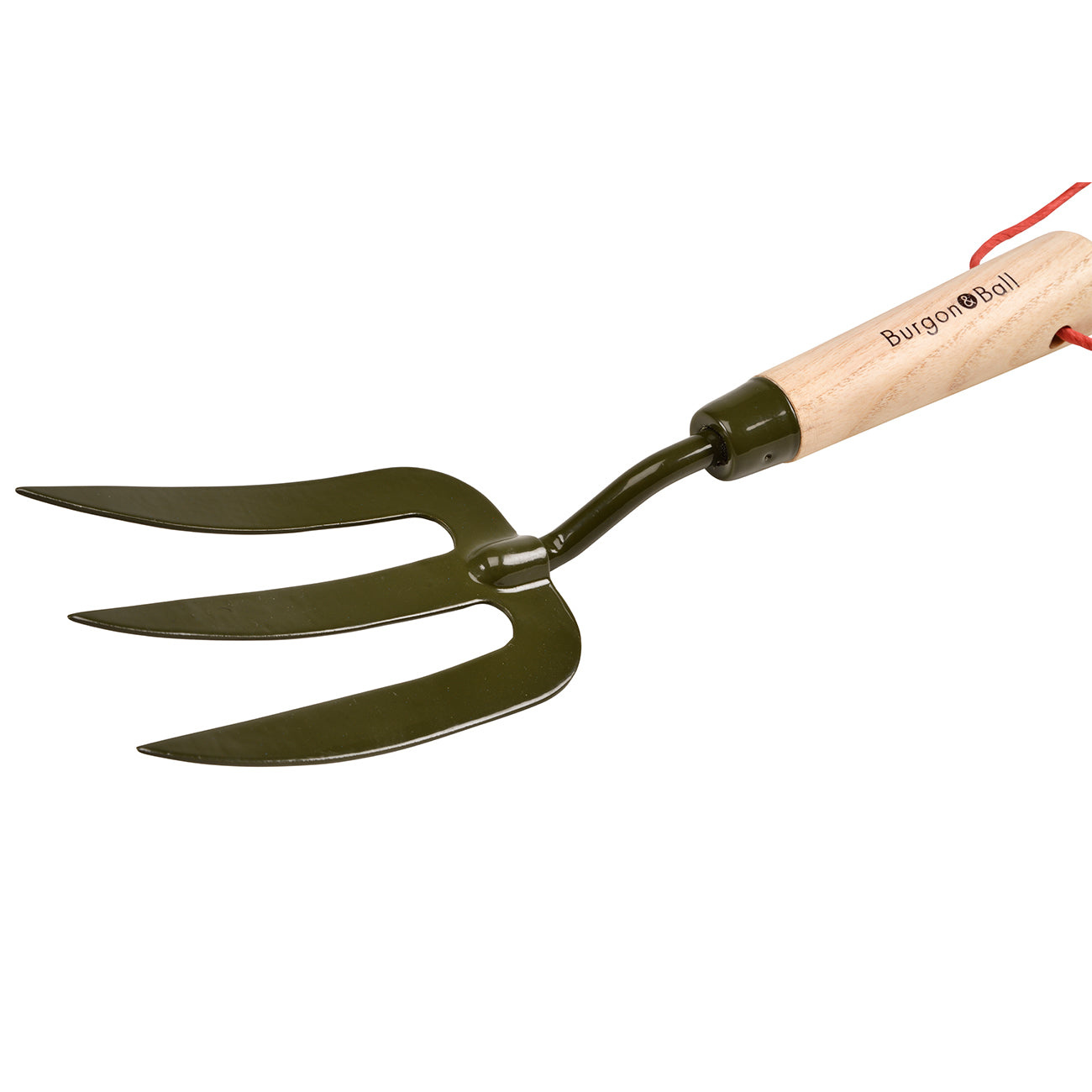 Een sterke poedercoating in een opvallend groene kleur beschermt tegen roest. De puntige uiteinden snijden gemakkelijk in de grond, waardoor het graven licht werk wordt. Als individuele ontwerptouch is er een mooi donker houten inleg aan het einde van het houten handvat met de '&' uit onze naam. Een ophangkoord van gedraaid papier helpt om alles netjes te houden in de schuur.