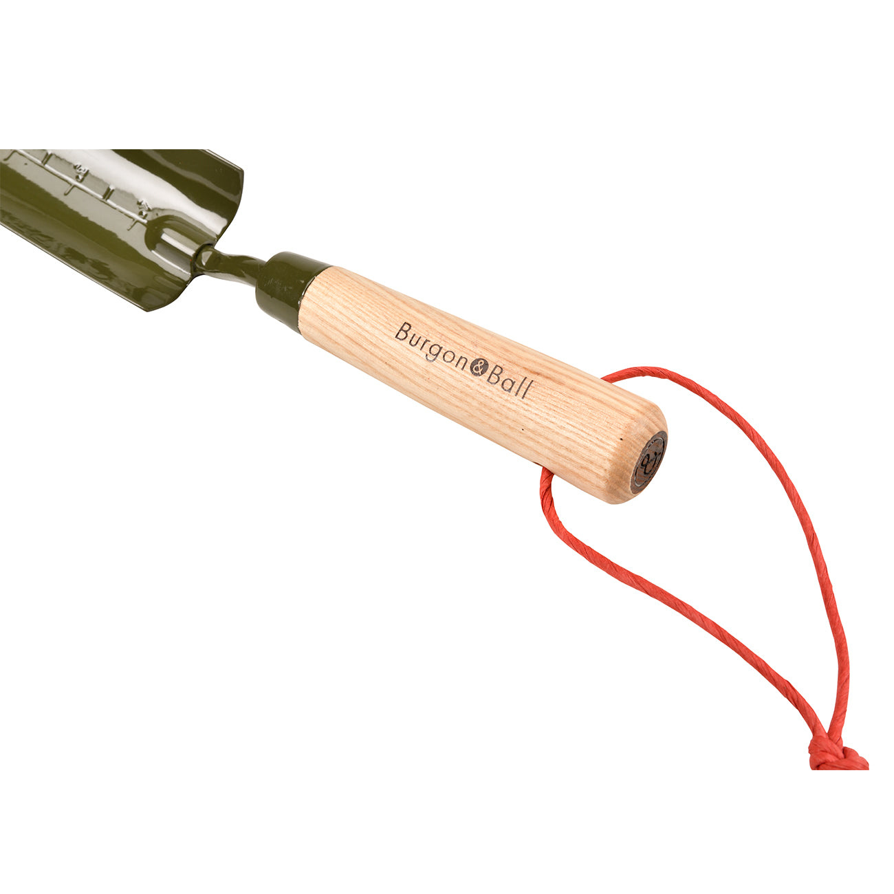 Een stoere poedercoating in een onderscheidend groen helpt tegen roest te beschermen. Als individuele touch is er een prachtige donkere houtinleg aan het einde van het houten handvat met het ‘&’ teken van de Burgon & Ball naam. Een ophangkoord van gedraaid papier helpt de dingen netjes te houden in de schuur.