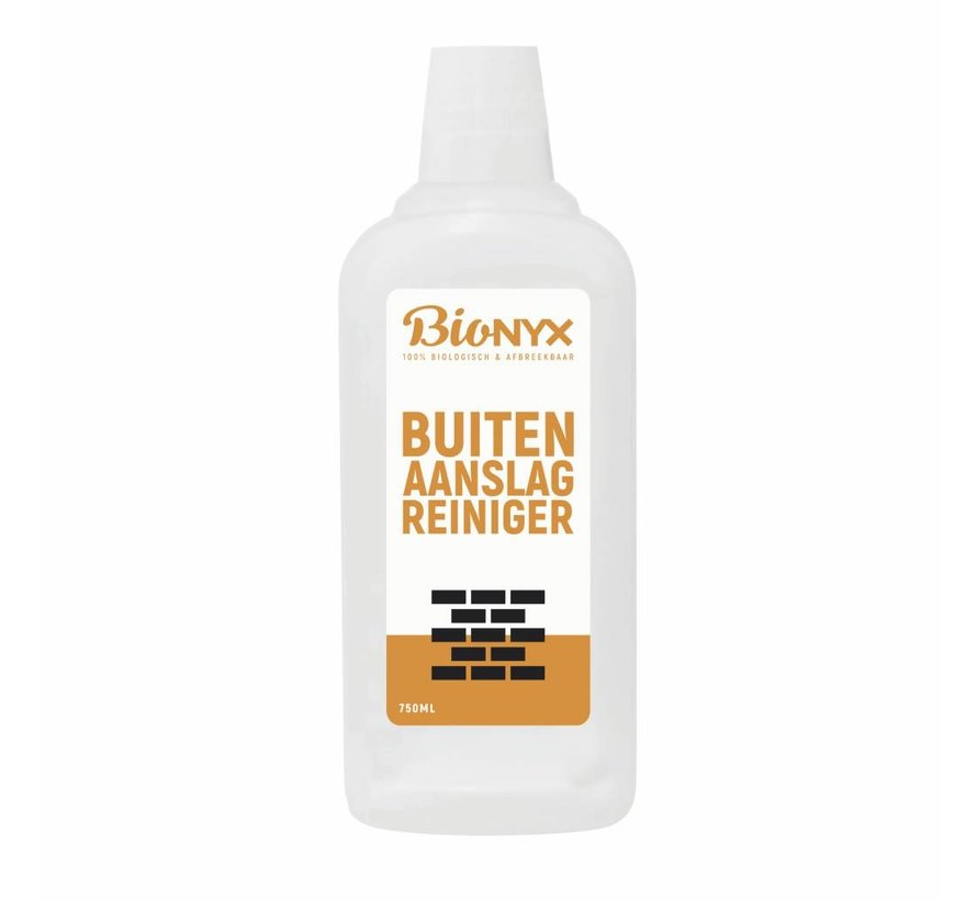 Verdun geconcentreerde BIOnyx Buitenaanslagreiniger in lauw/warm water(1:1 tot 1:3) in een vernevelaar en breng aan op een droge of licht vochtige ondergrond (o.a. steiger, opsluitbanden, border, bielzen, terra cotta bloempotten, beelden, ornamenten, daken of muren). Doe verder niets. Na 2-3 dagen eerste resultaten zichtbaar. Enkel gebruiken bij temperaturen tussen 5°C en 25°C. Niet in de volle zon & wanneer er regen verwacht wordt < 24 uur. Verbruik: ± 50m² met 5 liter verdund product afhankelijk van de vervuiling.