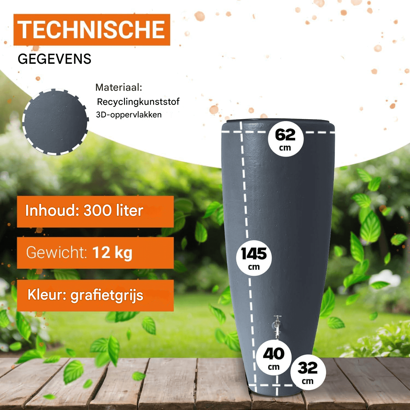 De 2 in 1 regenton in de kleur antraciet met een vaas design. Deze prachtige regenton heeft een inhoud van 300 liter en wordt geleverd inclusief chromen tapkraan en plantenbak. Dus zo heeft u een regenton met 300 liter en een plantenbak aan de bovenkant. Overtollig water wat in de plantenbak zit wordt automatisch uw regenton in geleid. De meegeleverde filter mat zorgt er voor dat het water niet vuil wordt.