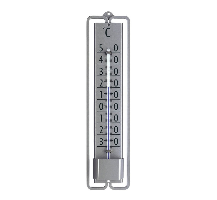 Metalen zilverkleurige thermometer voor binnen- en buiten gebruik. De thermometer is 19 cm lang en heeft grote en duidelijk cijfers.