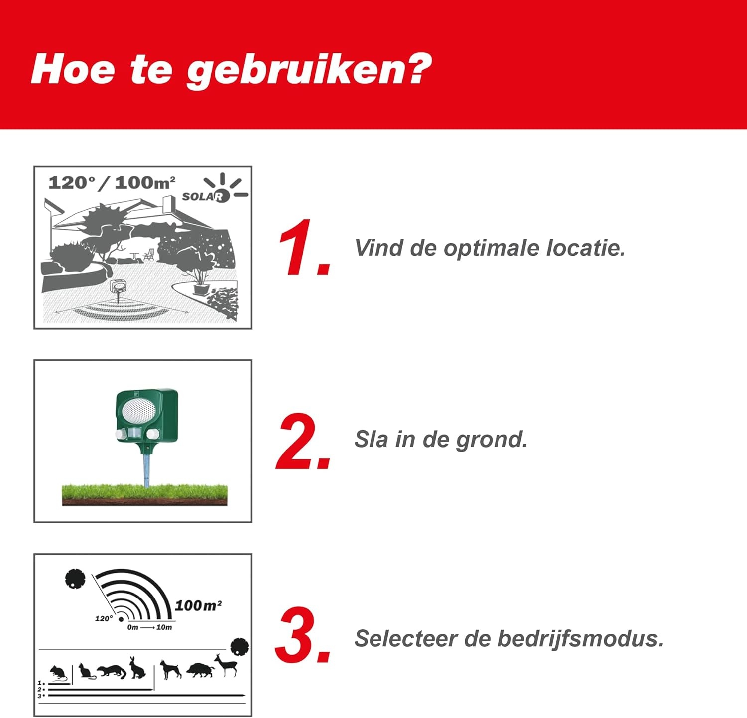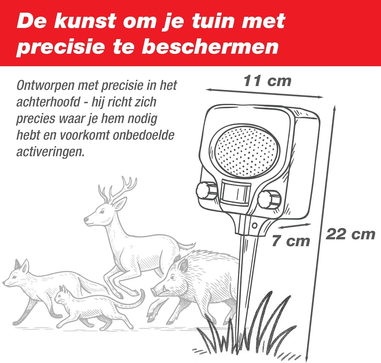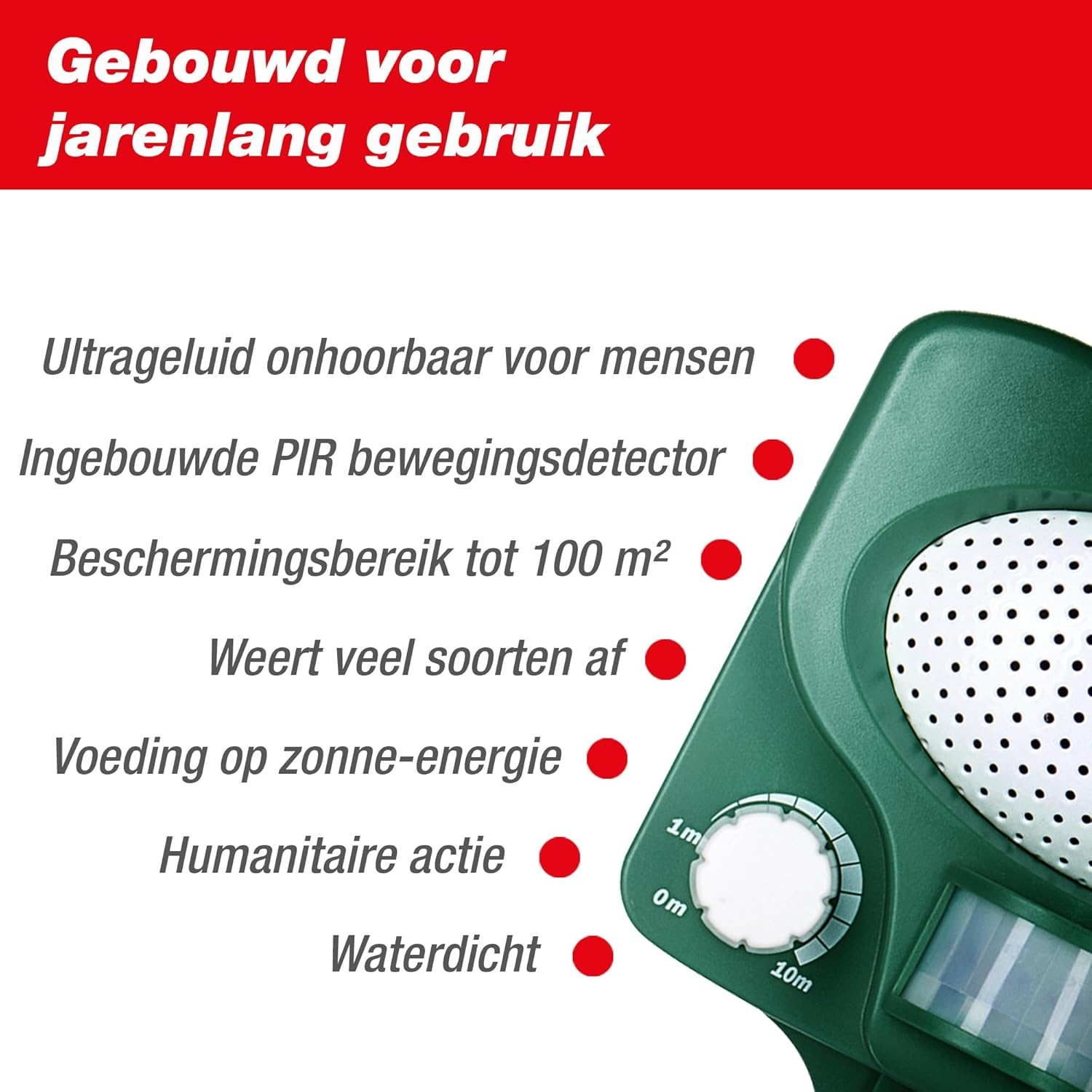 Op zoveel manieren biedt de Repeller u betrouwbare bescherming over een groot gebied en het gebruik ervan is eenvoudig en effectief. Het zonnepaneel van de verjager voedt oplaadbare AA-batterijen tijdens de uren van daglicht met voldoende elektrische energie om het door de uren van duisternis te laten werken en zo non-stop 24/7 gebruik mogelijk te maken. Het detecteert en verjaagt dag en nacht katten, honden, eekhoorns, marters, konijnen, vossen, wilde zwijnen, herten en andere hinderlijke dieren op een oppervlakte van 100 m².