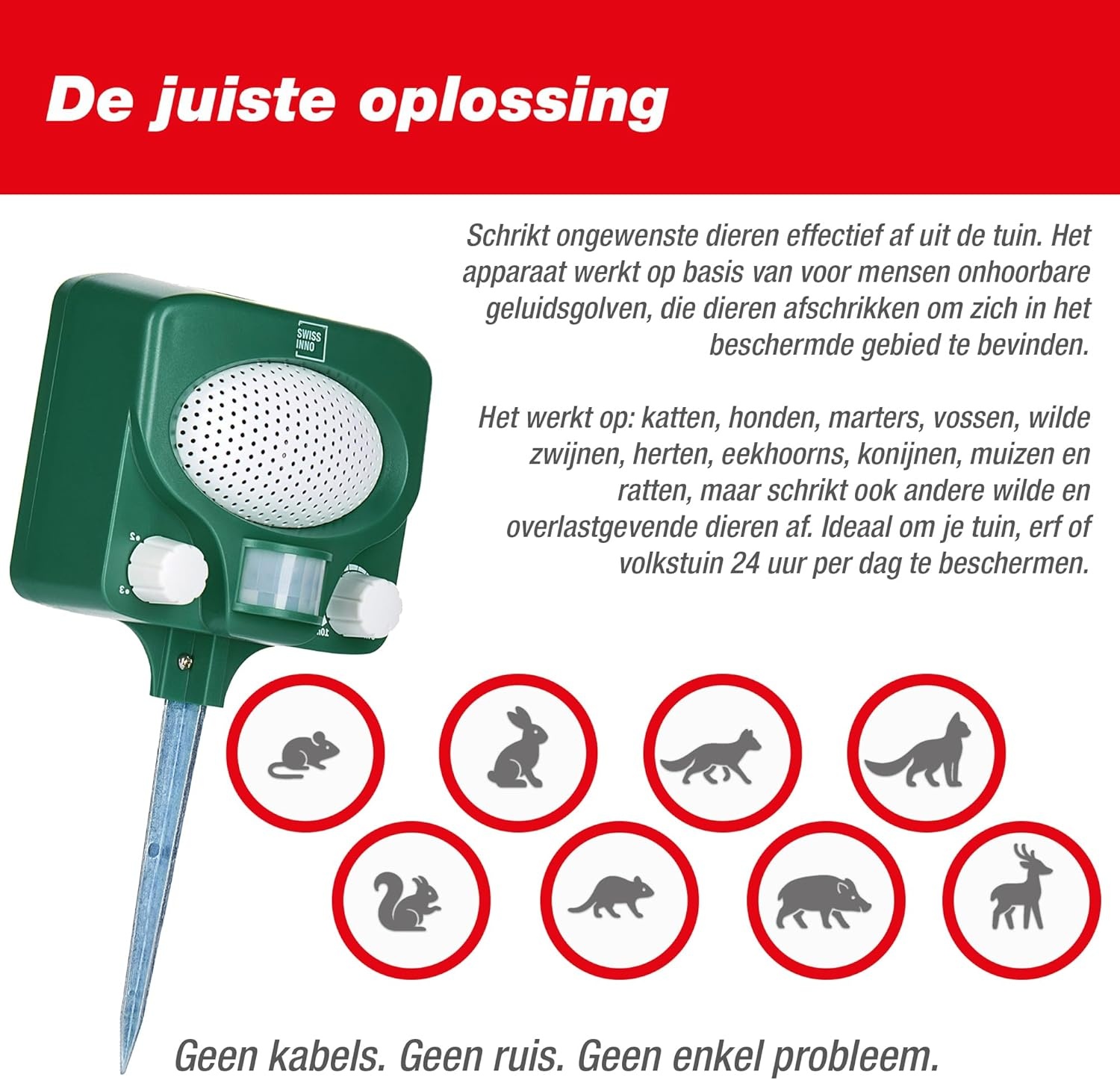- De SWISSINNO ultrasonische solar dierenverdrijver detecteert en verjaagt katten, honden, eekhoorns, marters, konijnen, vossen, wilde zwijnen, herten en andere hinderlijke dieren in uw tuin. De echo is onhoorbaar voor mensen en veroorzaakt geen schade aan dieren of huisdieren.