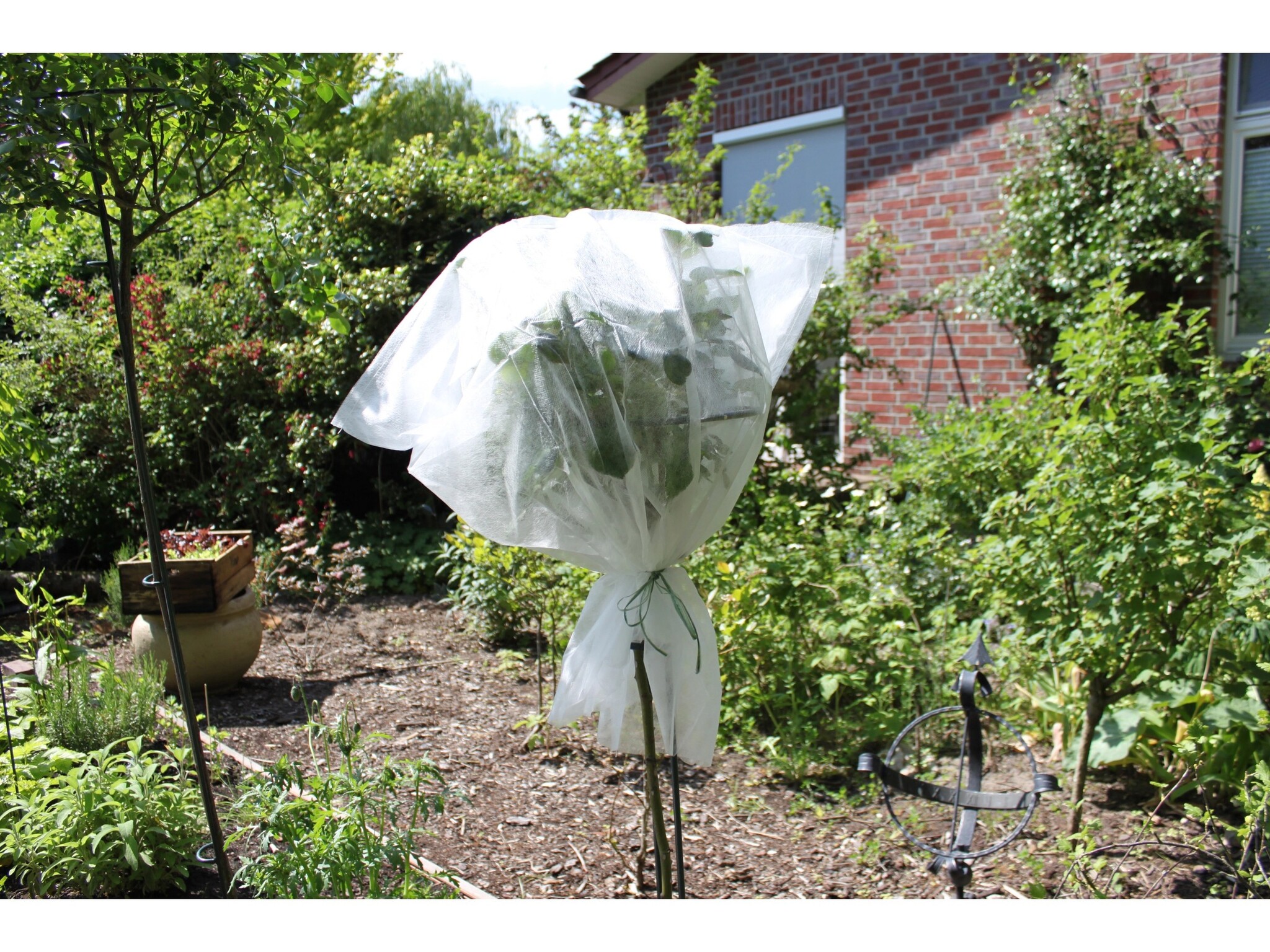 De Videx Garden vliesdoek, met een afmeting van 150 cm x 500 cm in het wit, beschermt de kronen van pot- en kuipplanten. De groenblijvende planten worden beschermd tegen vorst en uitdroging doordat uitdrogende winden gebroken worden en de winterzon wordt getemperd. Toch komt er nog voldoende licht bij de bladeren. Ook in de borders kunnen de kronen van rozen en gevoelige struiken beschermd worden tegen vorst, ijzige wind of intense winterzon.