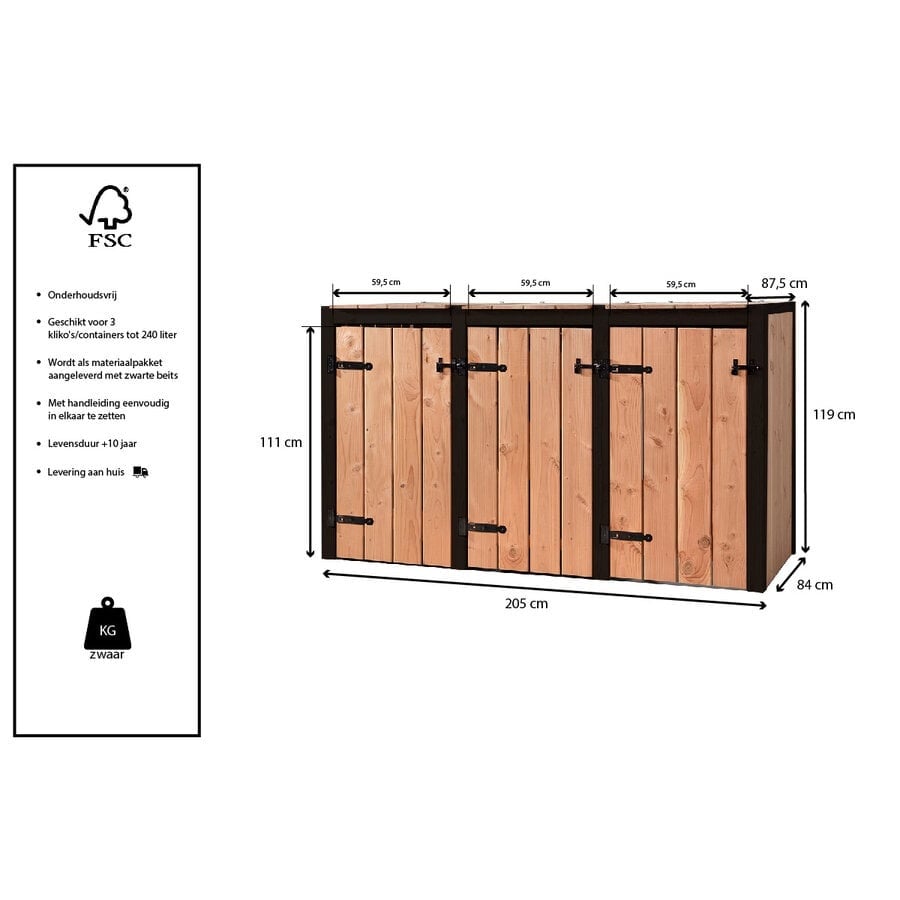 De containerombouw Suze, Mia, Laura, Nina en Rosie zijn de perfecte oplossing om uw enkele of meerdere containers (tot 240 liter) discreet en stijlvol uit het zicht te plaatsen. Dankzij het compacte en ruimtebesparende ontwerp past deze houten ombouw moeiteloos in kleinere tuinen, smalle stegen of naast uw voordeur.