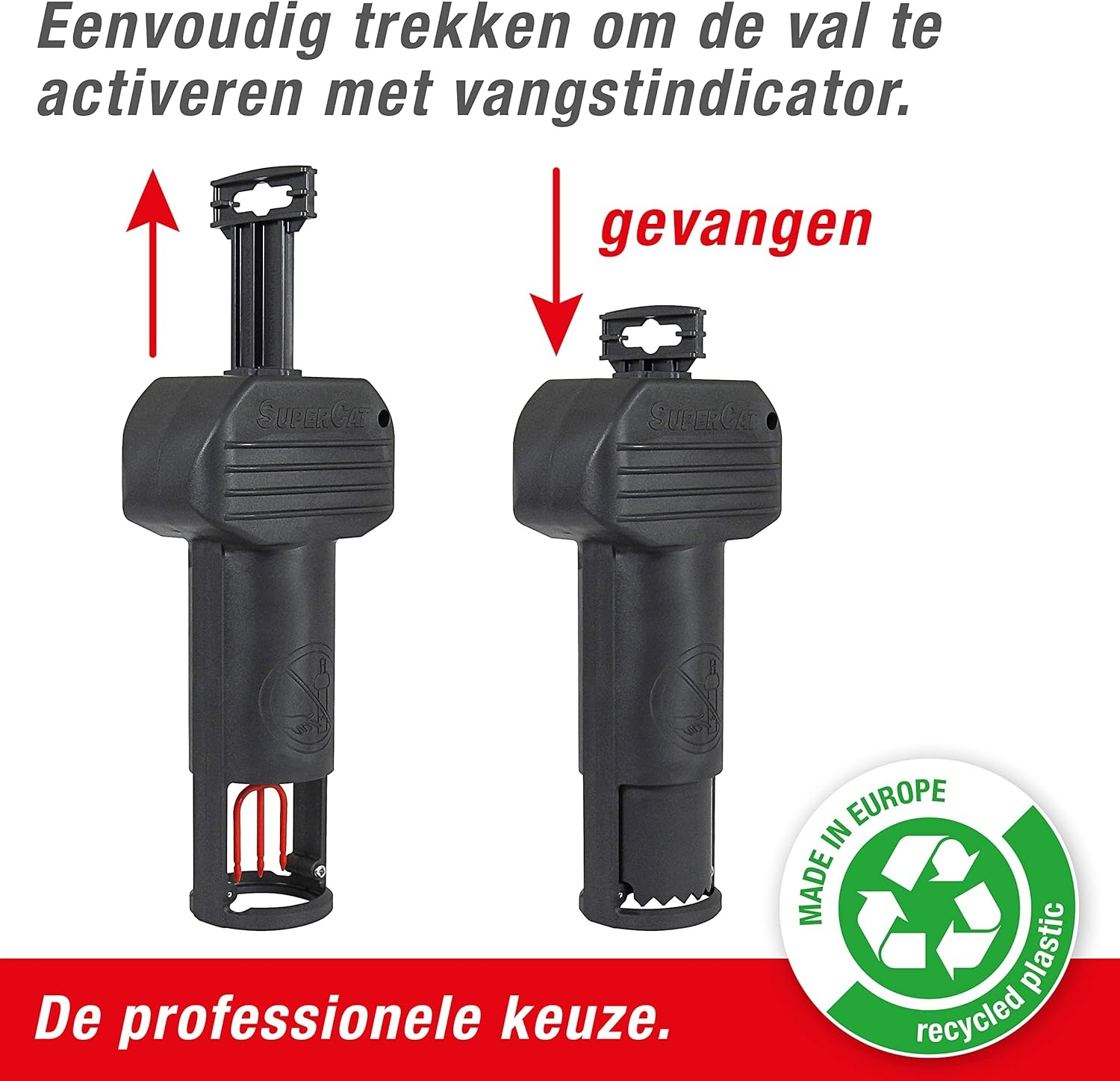 De val geeft duidelijk aan wanneer hij geactiveerd is, want de handgreep is dan naar beneden. Vangt woelmuizen komend uit beide richtingen van de gang. Ongevaarlijk voor gebruiker en huisdieren.